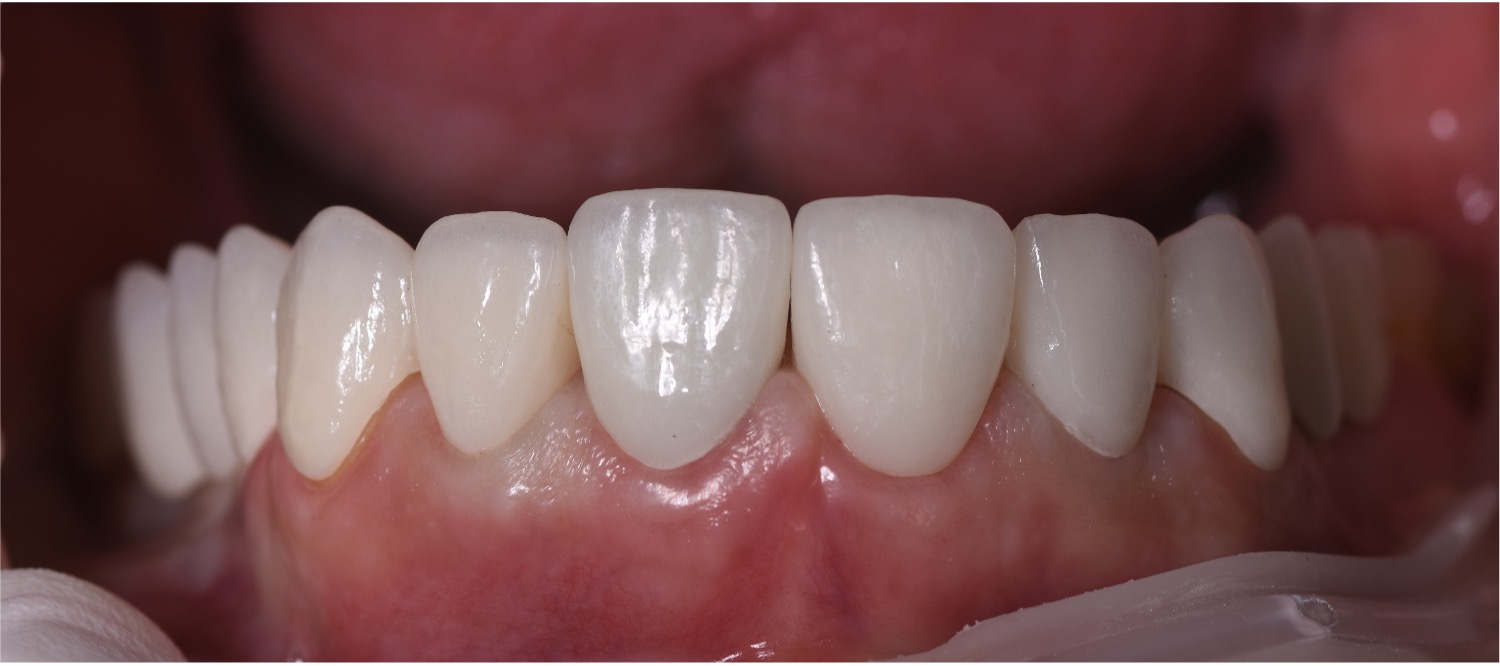 between soft tissue recontouring and restorative space. Maintaining the biologic width during gingival correction was critical to avoid complications and preserve long-term periodontal health. Ensuring that the final restorations matched the digital mockup in both form and shade required close coordination between the design and lab teams. These